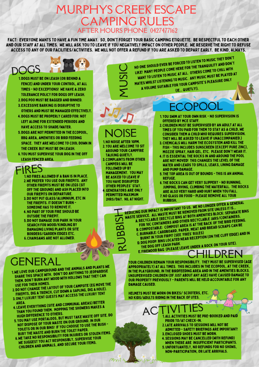 It’s important to note that additional site fees apply for dogs and horses. This fee helps cover the costs associated with providing suitable facilities and maintaining a safe environment for everyone. By implementing this policy, Murphys Creek Escape aims to ensure that the resources and amenities provided for pets and their owners are of high quality.
