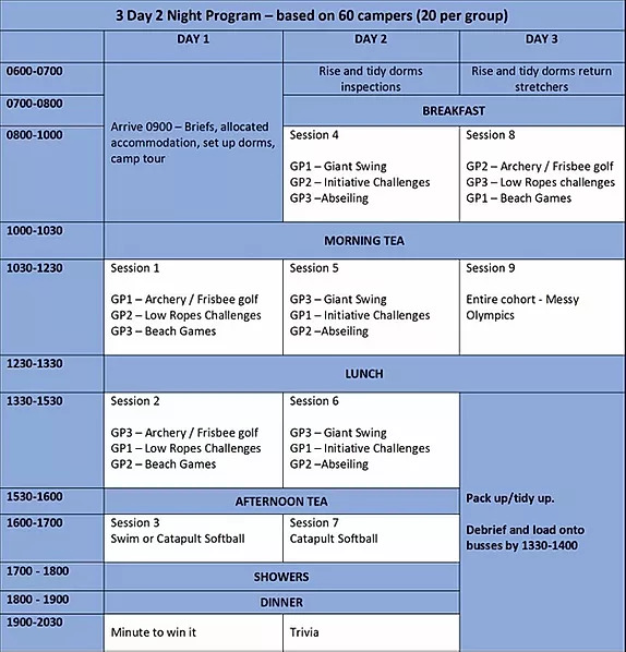 An example program for a 3 day/2 night camp is attached. This is an example of a program only. It can be used as is or adapted to suit your schools’ specific needs and objectives. We can offer camps of duration between 1 day/0 nights up to 5 days/4 nights.